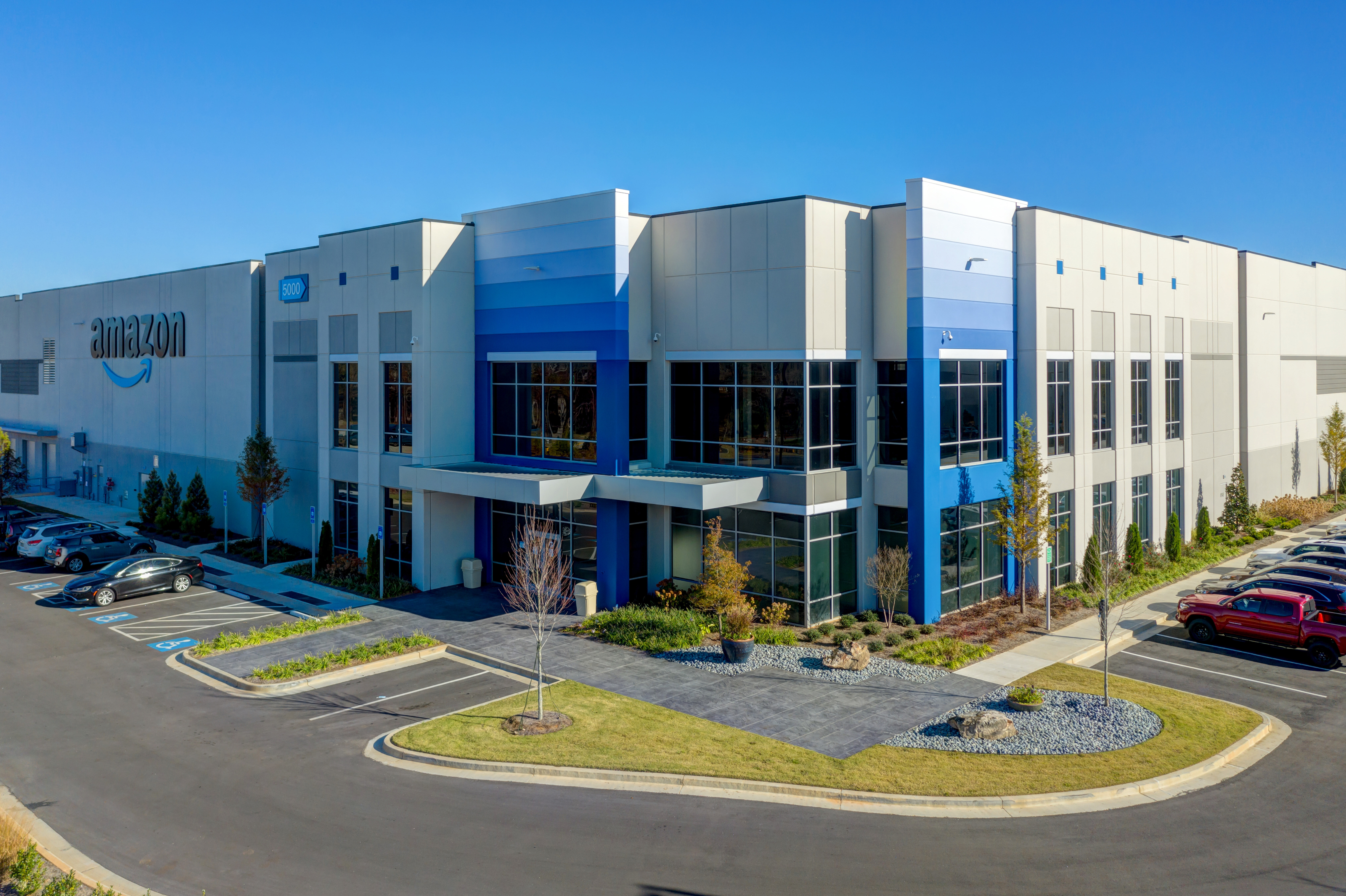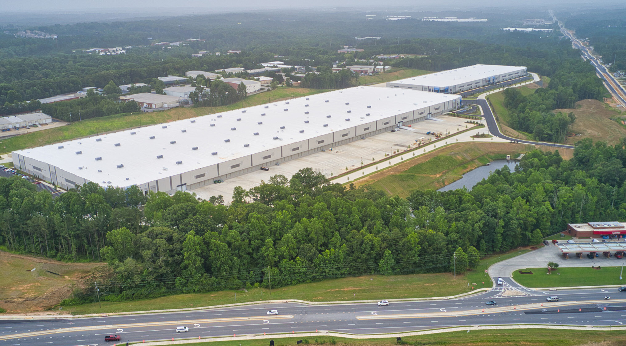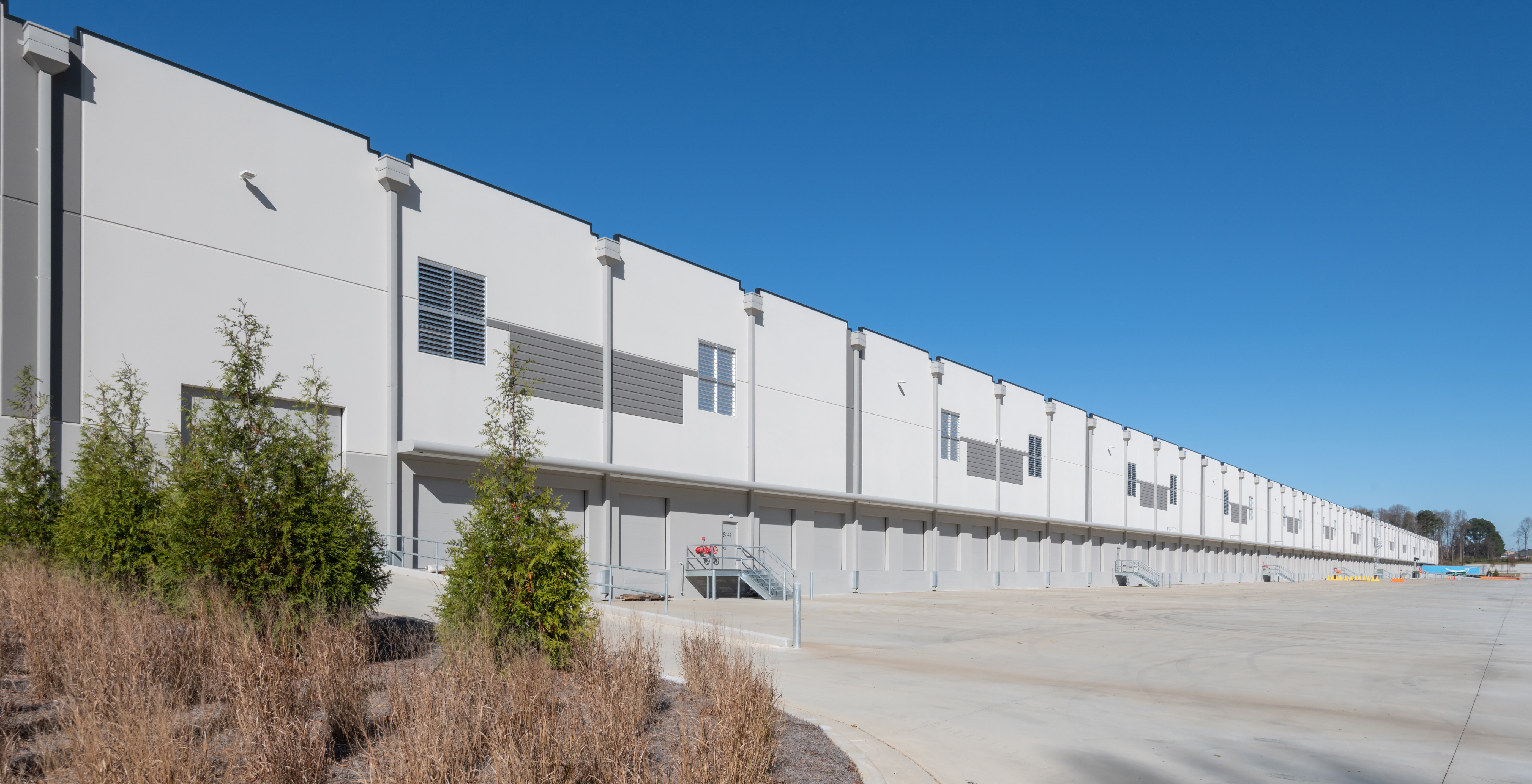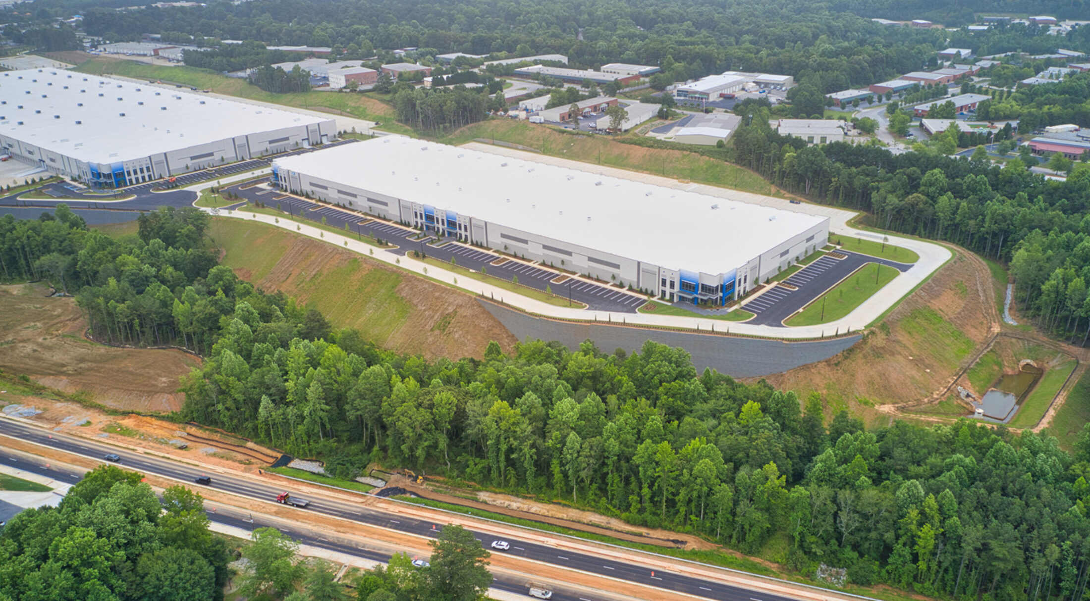 Lanier Logistics Center Buildings 1 and 2 a good example of a design duo that consists of two concrete tilt-up buildings utilizing various colors and shapes with alternating depths thereby creating shadows to provide visual interest to the façade. Multi-height glass storefront with accents of composite metal panel canopies accentuate the design creating a dramatic and inviting atmosphere to the building entrance.