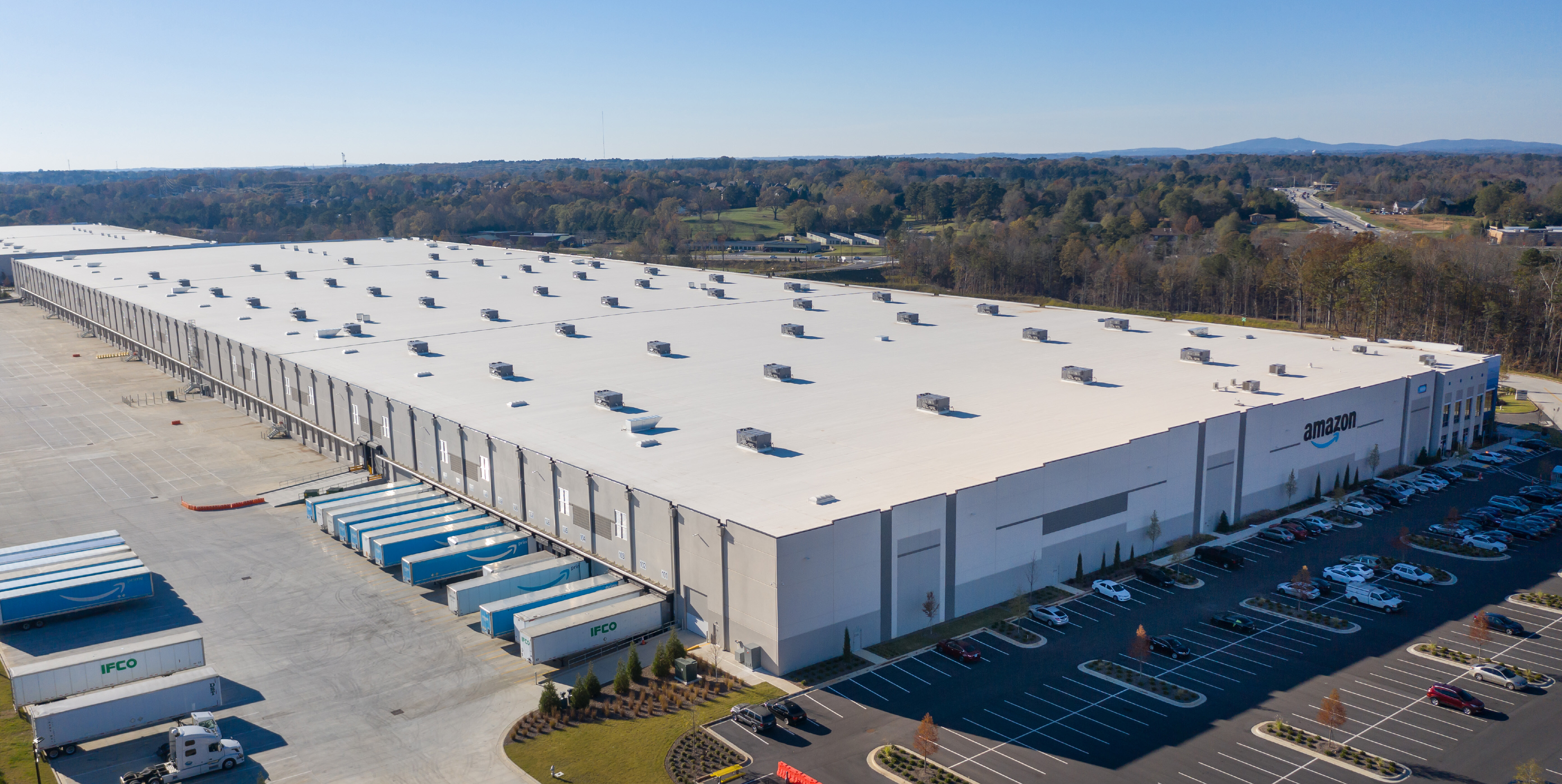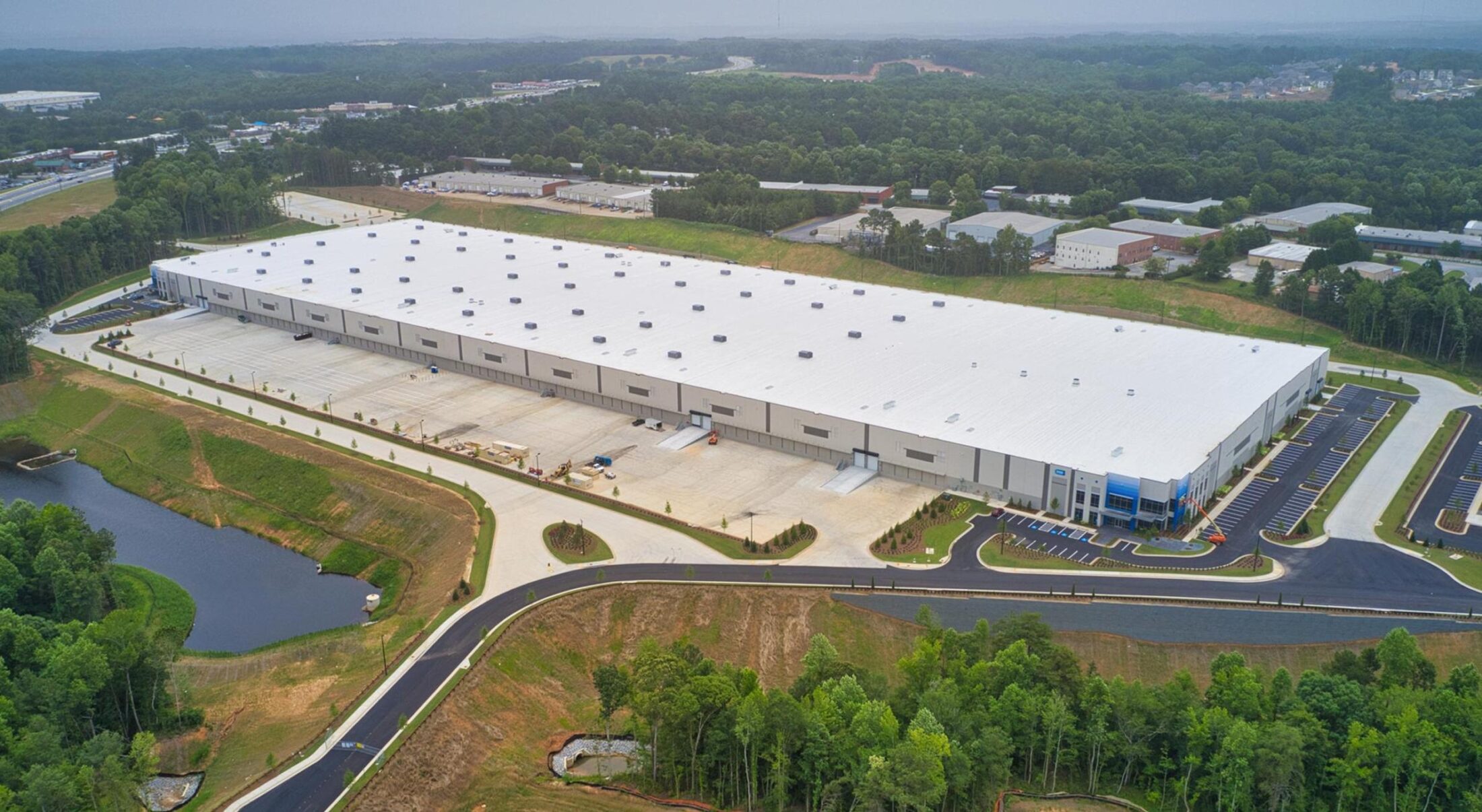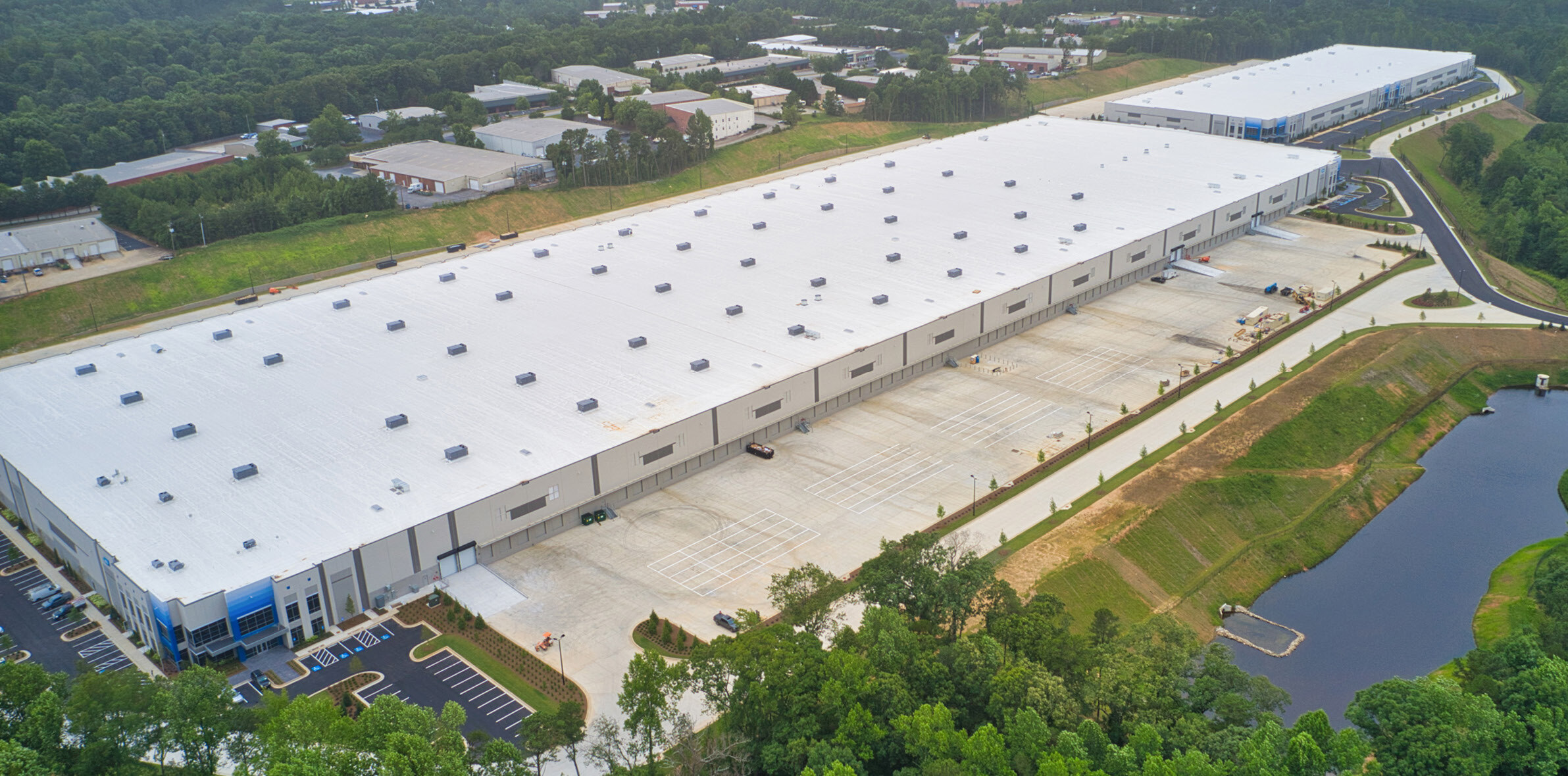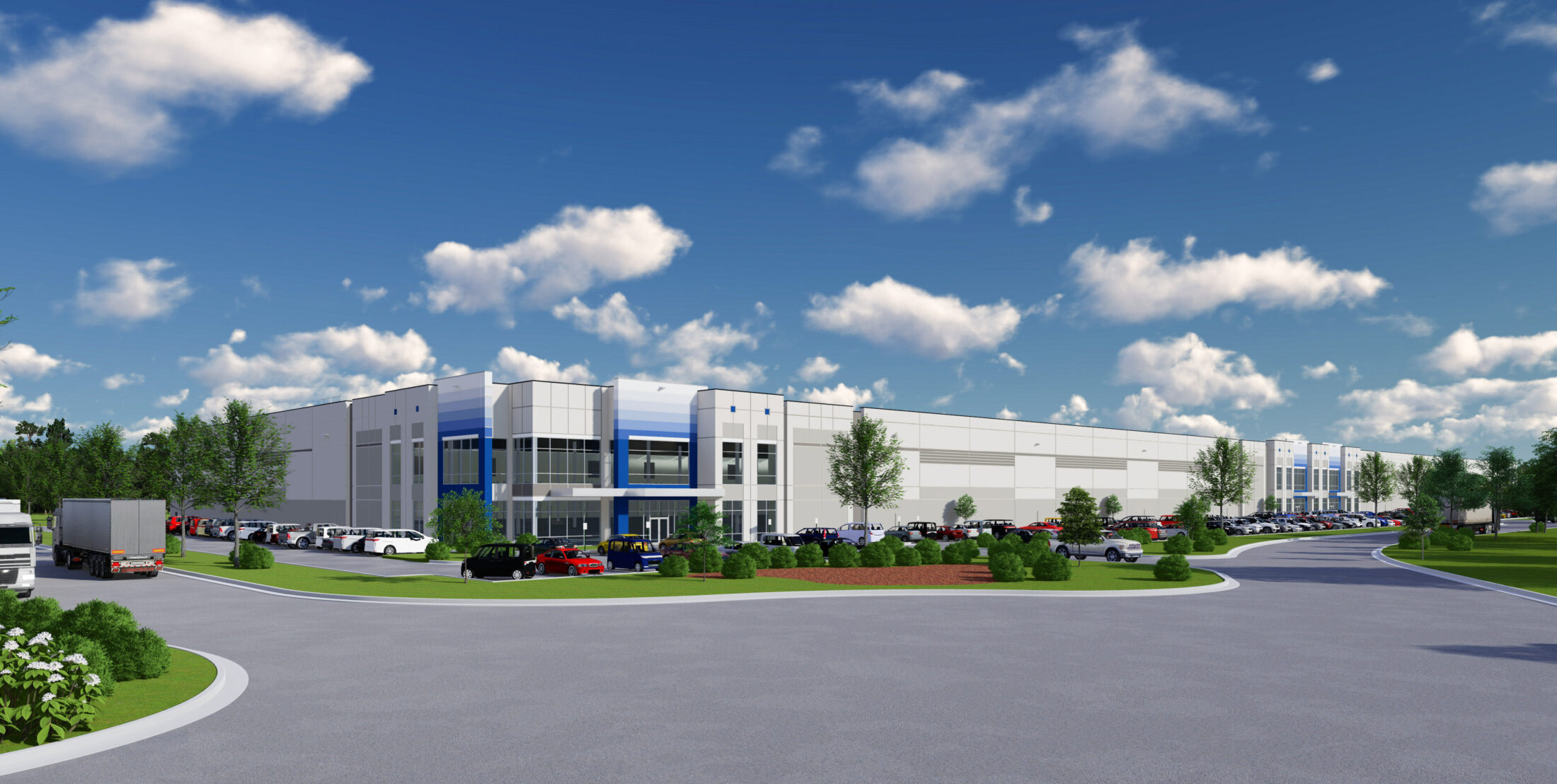 Lanier Logistics Center Buildings 1 and 2 a good example of a design duo that consists of two concrete tilt-up buildings utilizing various colors and shapes with alternating depths thereby creating shadows to provide visual interest to the façade. Multi-height glass storefront with accents of composite metal panel canopies accentuate the design creating a dramatic and inviting atmosphere to the building entrance.